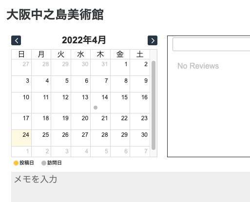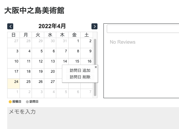 これまでは、口コミ投稿から訪問日を登録するしかなかったのですが、 今回のリリースで手軽にカレンダー上から訪問日を追加できるようになりました! 使い方は簡単です! マイページの各美術館のカレンダー上で、訪問日を登録したい日付のセルをクリックします。 すると、下記のように「訪問日の追加」「訪問日の削除」のボタンが表示されます。