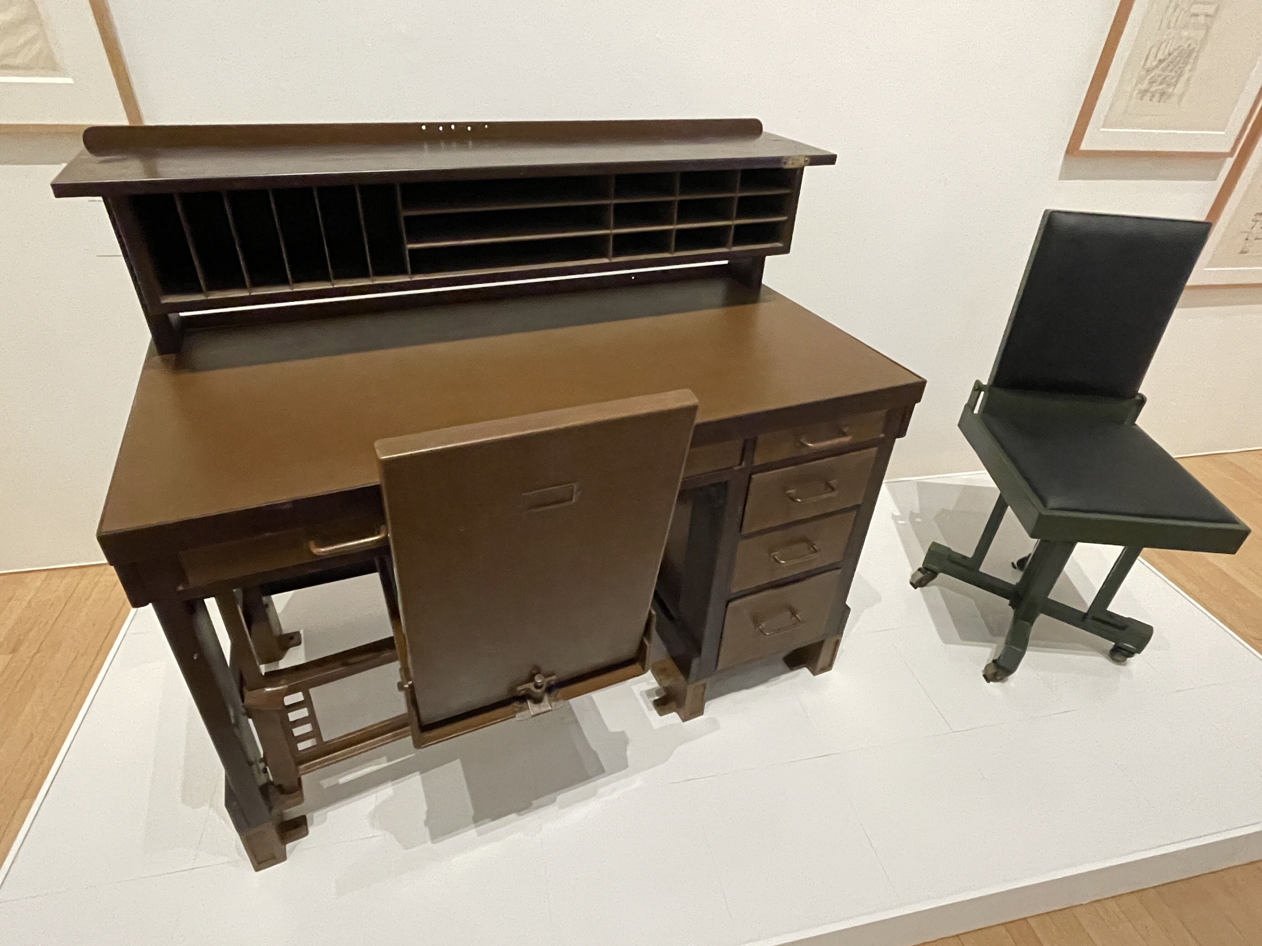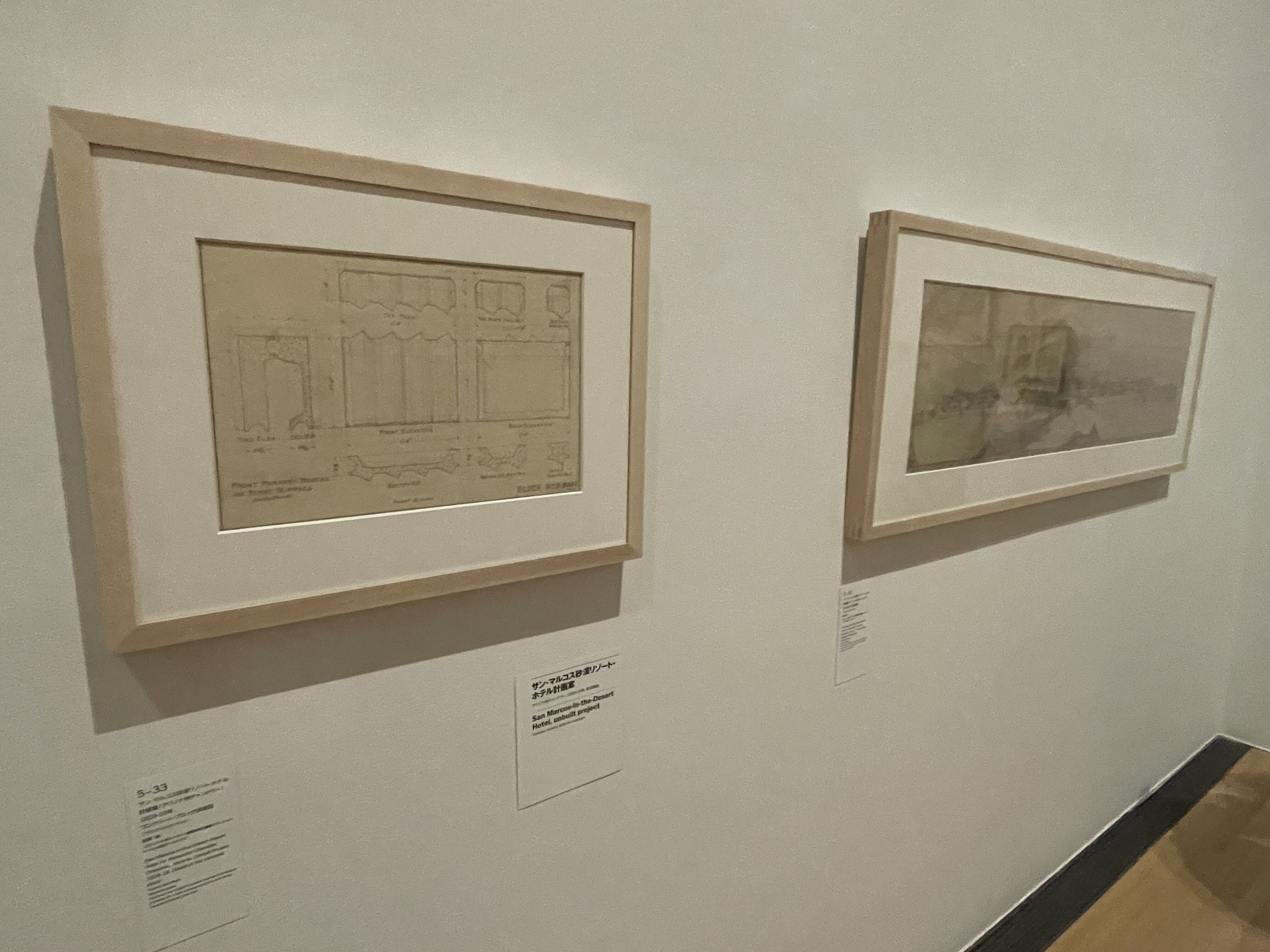 フランク・ロイド・ライトの建築思想、設計した建築における数々の図面、模型、また椅子・机などのインテリアなどが展示されていた。旧帝国ホテル、プレーリー様式の数々の邸宅、タリアセン、アンビルト高層建築の「マイル=ハイ・タワー」、都市構想であるブロードエーカー・シティーなど様々。